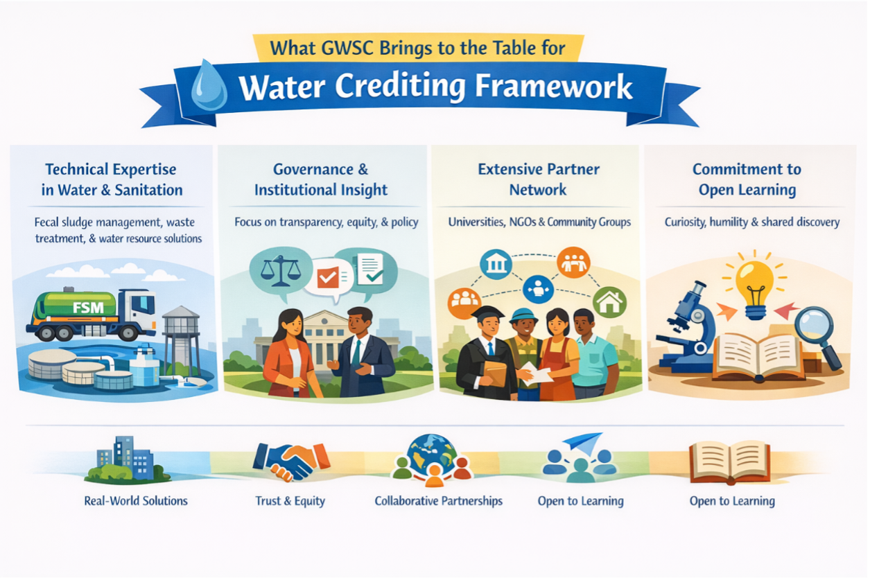 For GWSC, this means approaching the exploration of water credits not as a program to be launched, but as a conversation to be joined. We are listening for the insights of utilities grappling with fecal sludge management, the concerns of communities who must benefit from any mechanism designed in their name, and the questions of policymakers and investors wondering whether these tools can deliver on their promise. If these questions resonate with you, we hope you will reach out, not with proposals, but with curiosity. Should opportunities arise to develop joint proposals that advance this exploration, and where funders are willing to invest in answering these questions together, we would be pleased to contribute GWSC’s expertise and perspective. There is much to learn together.