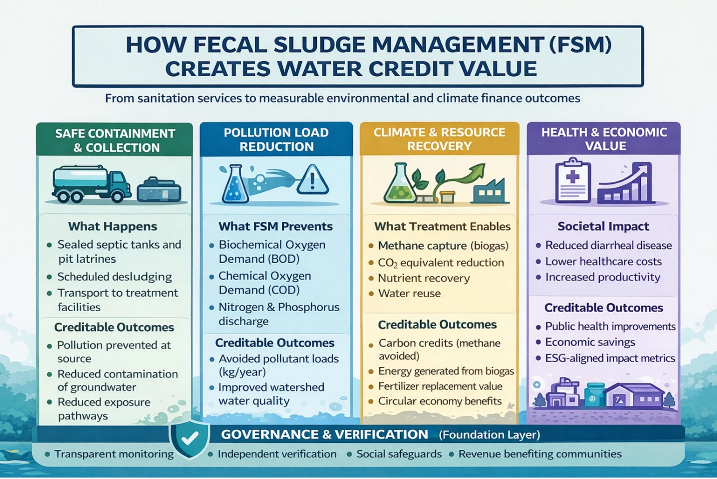 These two insights from GWSC Co-Directors: governance as the foundation and fecal sludge management as a high-impact opportunity are forming a potential mechanism for a credible, equitable water crediting scheme to transform sanitation in significant ways and currently GWSC is exploring and marking its role to play.