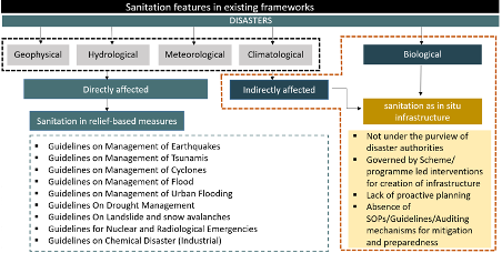 India’s unplanned urbanization has made urban environments increasingly fragile, exposing residents to increased economic, social, and environmental risks. Urban poor neighbourhoods, marked by poor living standards and inadequate infrastructure, are especially vulnerable to periodic disasters. Access to safe water and sanitation, in the wake of any disasters, becomes harder to access often leading to disease outbreaks like cholera, dengue, and malaria, highlighting the urgent need for better and continued water supply and sanitation service delivery. The recent Covid-19 pandemic, particularly underscored the importance of devicing risk-informed disaster mitigation strategies. Current disaster management plans and implementation frameworks have a strong response-focus, often lacking a thorough vulnerability assessments, preparedness and mitigation strategies, potentially limiting to integrate disaster risk reduction (DRR) across sectors. This study aimed to review the existing DRR framework in the context of CWIS framework and provides insights to integrate CWIS as a mitigation strategy to minimise the disproportionate impact of disasters on the most vulnerable urban populations.