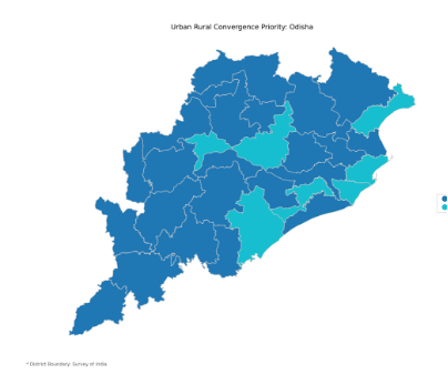 “urban-rural convergence” approach aims to leverage the existing FSM treatment infrastructure and desludging services in urban areas to provide FSM service in neighbouring rural areas. It bridges the urban-rural divide of safe sanitation practices, minimising the need for creating additional infrastructure, and provides opportunities for institutional convergence for universalising sanitation outcomes. This approach has consequential positive impact on local environmental, pollution abatement efforts and reduced health risks associated with unsafe management of faecal waste. Dhenkanal was the first city in the country to demonstrate a comprehensive approach by extending existing FSM services from Dhenkanal Municipality to neighbouring Gram Panchayats (GPs). Subsequently, the efforts were scaled up within the Dhenkanal District and the Ganjam District to demonstrate a model for Urban Rural Convergence in Odisha
